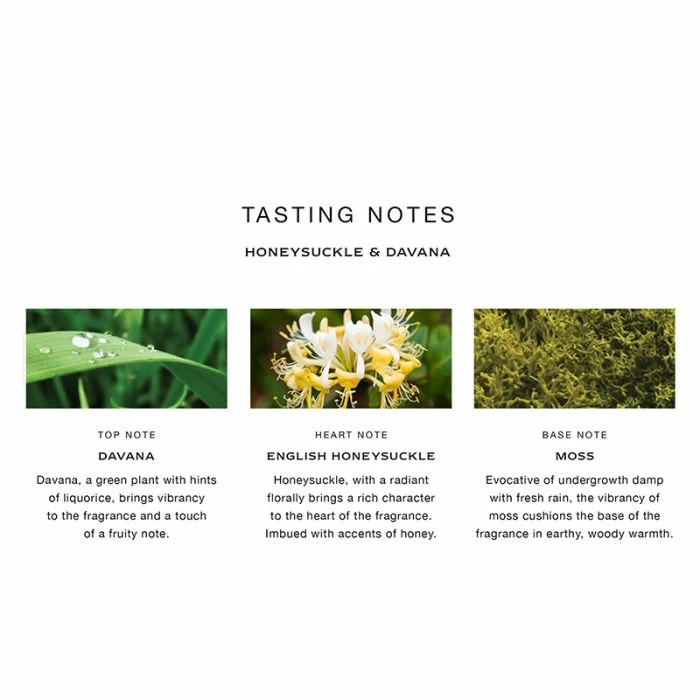 The wildness of honeysuckle, winding through the English countryside. Climbing. Twisting. Ever more alluring after dark. Fresh with rose and the aromatic, fruity twist of davana. Woody with moss. Warmed by sunshine. To uplift, to wind down, or simply to add an air of luxury. Candle burn time is 45 hours and includes lid. H9.2 x W7.5cm.